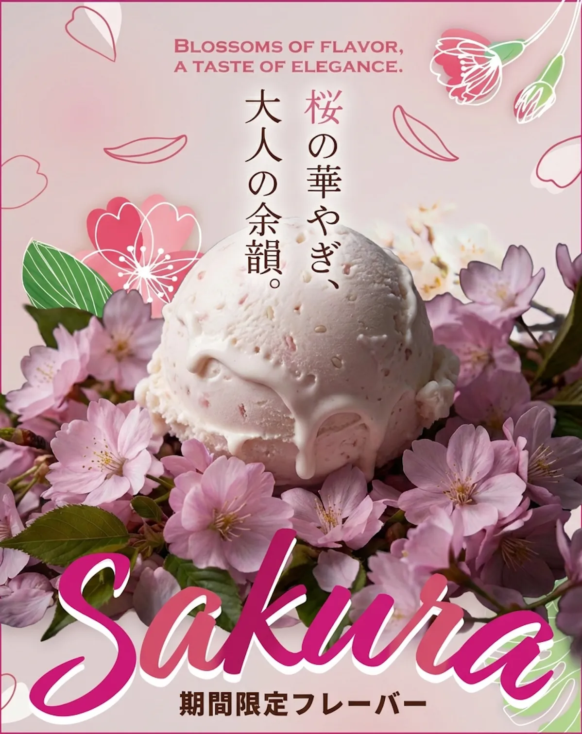 この「さくら」フレーバーの最大の特徴は、濃厚なココナッツベースに桜の柔らかな香りを巧みに重ねている点です。口にした瞬間、芳醇な香りが広がり、さらなる奥行きをもたらすローズペタル、ほのかな酸味のあるラズベリー、そして神秘的なスターアニスとの組み合わせが、まさに大人のためのデザートを実現しています。そして、洋酒に漬け込まれたチェリーの香りが重なり、食後の余韻を楽しむことができるのです。