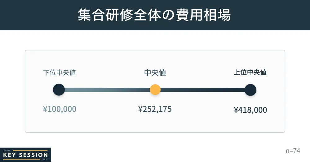 ここで、集合研修全体の費用の中央値は252,175円であり、調査対象には新入社員研修や管理職研修、リーダー研修などが含まれています。この調査には、さまざまな研修カテゴリのデータが組み込まれているため、後述する内容は企業が研修を検討する際に非常に参考になります。
