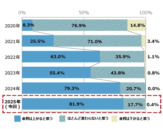 調査では、金融機関の融資姿勢が昨年に比べてさらに厳しくなったことが明らかとなりました。調査の結果、8割以上が「金利は上がる」と見込んでおり、実際に融資審査が厳しくなる傾向が加速しています。