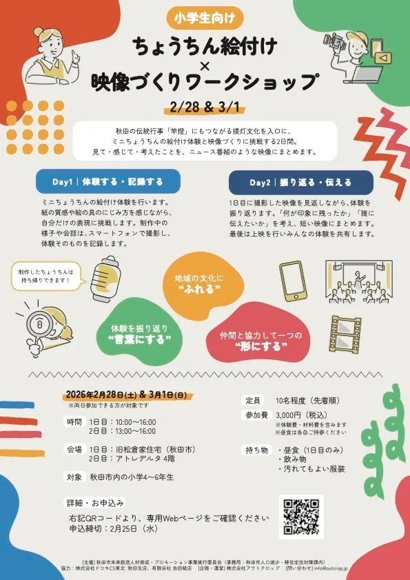 秋田市では、「ちょうちん絵付け×映像づくりワークショップ」が開催されます。この特別なプログラムは、秋田の地域文化・提灯制作を通じて、参加者が手を使い、心を表現する機会を提供します。2日間のセッションを通じて、参加者は自分だけのミニちょうちんを制作し、それを映像に収めるという新しい形の学びが体験できます。