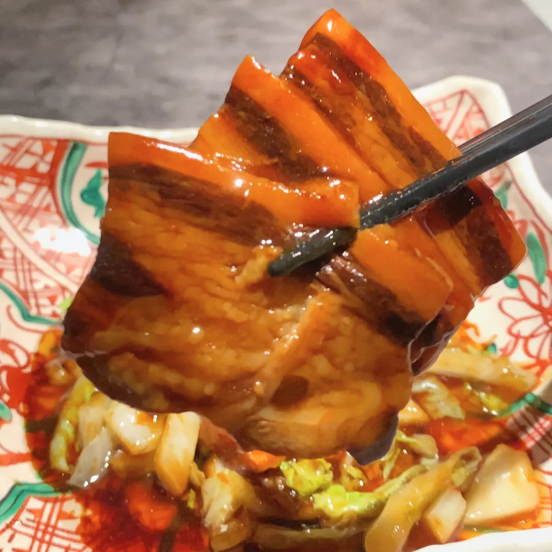 まずご紹介するのは、「豚バラと天津冬菜の重ね蒸し煮」です。この料理は、中国語で「芽菜扣肉」と呼ばれ、発酵させた芽菜(漬物)と豚バラ肉をじっくり煮込んだ一品です。680円(税込)で、柔らかな豚バラの口当たりと、漬物の香りが口の中で広がります。特に、冬にぴったりの温かみのある料理で、寒い日に最適です。豚バラの脂身がとろけ、旨みが重なったこの料理は、心地よい温もりをもたらしてくれるでしょう。