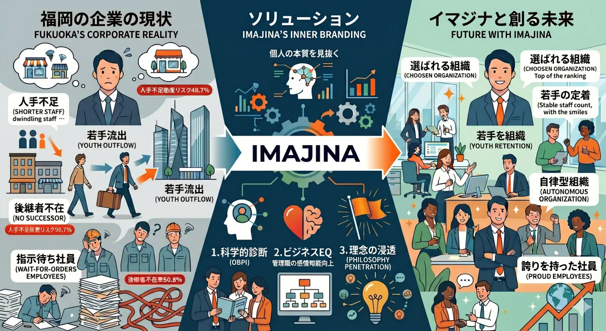 2026年6月15日、博多で開催される「経営者のためのインナーブランディングセミナー」についてお知らせします。このイベントは、企業のブランディング支援を通じて3,000社以上の実績を持つ株式会社イマジナが主催します。本セミナーでは、福岡経済の発展を妨げる要因として挙げられる「人手不足」や「事業承継問題」を解決すべく、英ケンブリッジ大学との提携により開発された科学的診断ツール「OBPI」を使用した組織改革の手法が紹介されます。