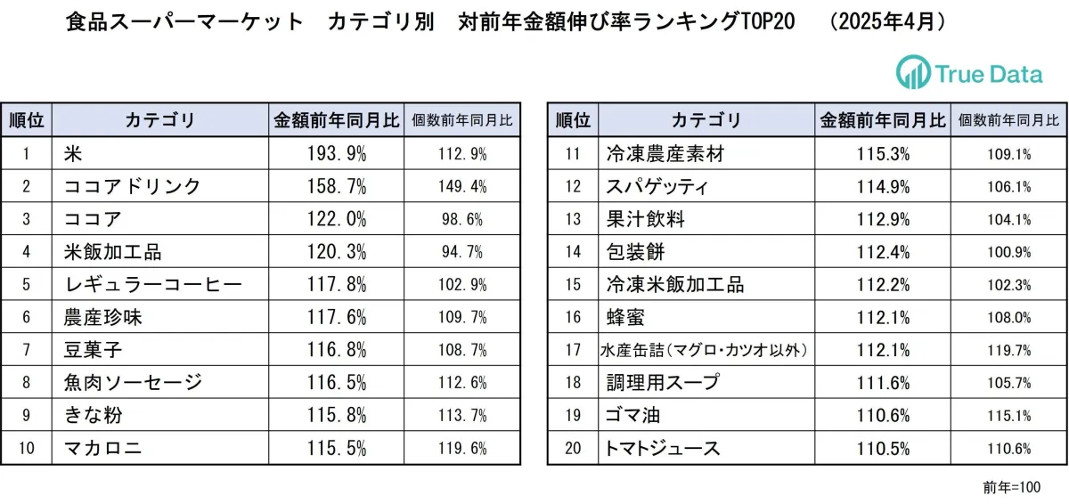 2025年4月、株式会社True Dataが発表した統計データによると、食品スーパーマーケットとドラッグストアの両業態で「米」の売上金額が前年同月比で約2倍にまで膨れ上がりました。この背景には、主に価格の上昇が影響していることが示唆されています。売上個数の増加はおおむね1割程度に留まったため、利用者は数量よりも単価が高い商品を選んでいるとの見方が浮かび上がります。