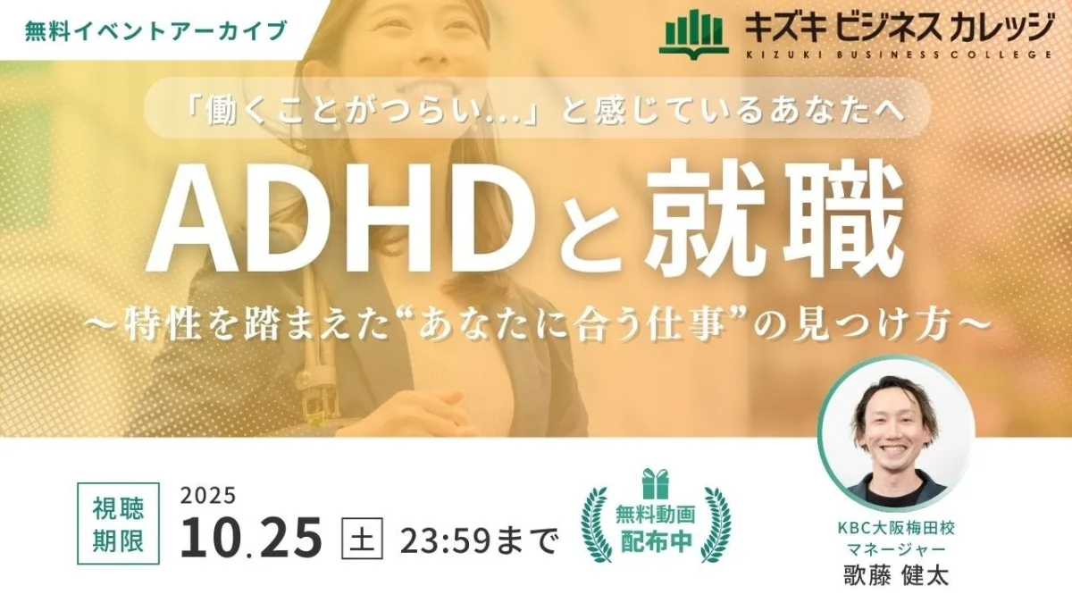 ADHD(注意欠如・多動症)は、多くの人に影響を与える特性であり、就職活動において特に悩ましい課題が存在します。キズキビジネスカレッジ(KBC)は、この課題を解決するために「ADHDと就職」に特化した無料オンラインイベントを2025年9月18日に開催しました。このイベントのアーカイブ動画が、2025年10月25日まで無料で視聴可能です。