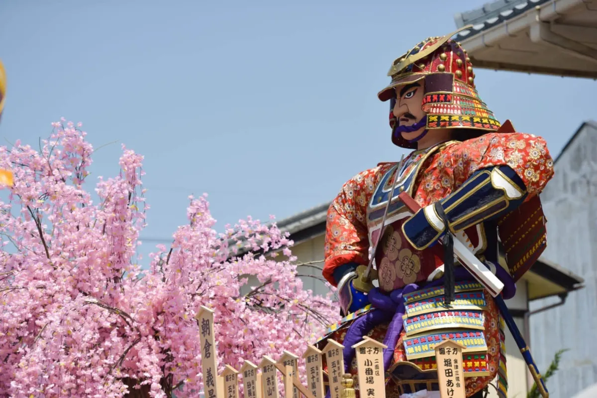 「芦原温泉春まつり」の当日は、豪華な山車や子ども芸妓の華やかな演舞が、市街地の中を巡ります。特に目を引くのは「朝倉孝景」をテーマにした人形山車で、これが祭りの主役として圧巻の迫力を発揮します。