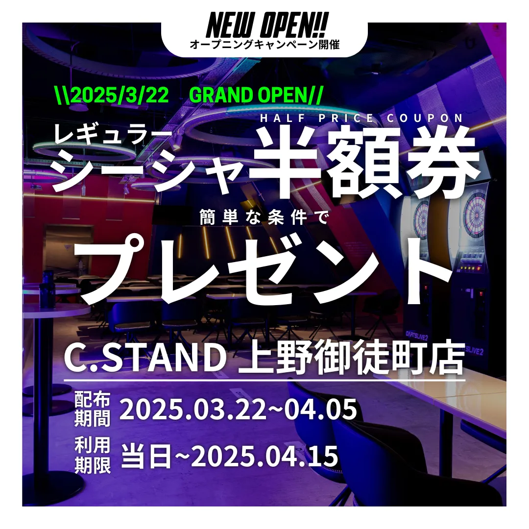 「C.STAND 上野御徒町店」オープンを祝して、シーシャの半額キャンペーンが行われています。このキャンペーンは2025年3月22日から4月5日までの間に配布され、利用は当日から4月15日まで可能です。この機会にシーシャの魅力を体験してみてはいかがでしょうか?