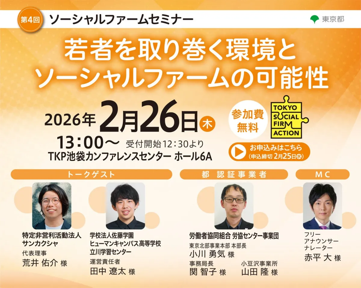 登壇者には、労働者協同組合ワーカーズコープ・センター事業団の代表である小川勇気氏、同事務局長の関智子氏、そして小豆沢事業所の山田隆氏がいます。これらの専門家たちは、ソーシャルファームに取り組む中で直面した困難とその解決策、さらには若者の就労促進に向けた実践的な取り組みについてお話しします。