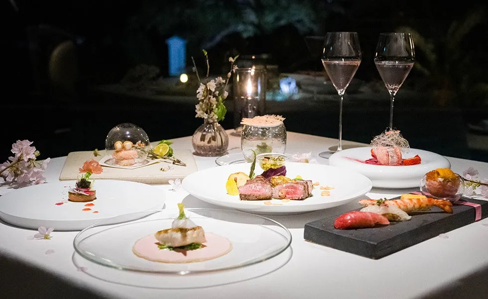 「FLEUR DE CERISIER」を楽しむための宿泊プランでは、全室オープンエアのプール付きスイートヴィラに滞在。約2万㎡の広大な敷地に広がる静かな環境で、大人のリゾートライフを満喫できます。沖縄の美しい自然の中で、特別なディナープランを味わうのは、まさに贅沢なひとときです。