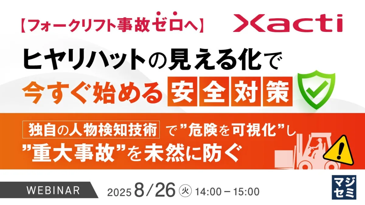 このウェビナーでは、作業者との接触リスクをリアルタイムで検知するセーフティカメラ「フォクレコ Connect」の活用法と、フォークリフト事故未然防止に向けた仕組みについて解説します。「フォクレコ Connect」は、高精度なAI技術を搭載した安全支援システムで、既存のフォークリフトに後付けが可能です。このシステムは、接近する作業者をリアルタイムで感知し、映像、アラート音、警告灯でその場で注意を促します。これにより、作業者との接触事故を未然に防ぐことが可能となります。