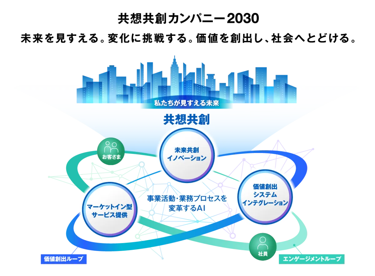 新たなビジョンは、「共想共創カンパニー2030」と名付けられています。この言葉には、お客様や社会の変化を先取りし、実際に進化し続ける企業でありたいという願いが込められています。企業は未来を見据え、変化を単なる挑戦と捉え、機会として捉える姿勢が求められています。顧客の立場に立ち、共に創造することで、本当に必要とされる価値を提供し続けることが求められます。