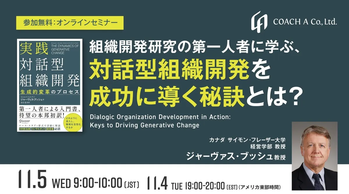 株式会社コーチ・エィが主催する無料のオンラインセミナーが、2025年11月5日(水)に開催されます。このセミナーの特別講師には、組織開発分野で著名なジャーヴァス・ブッシュ博士をお迎えします。全世界で支持されているベストセラー『Clear Leadership』の著者である博士が教える対話型組織開発の秘訣は、現代企業にとって欠かせない知識と言えるでしょう。