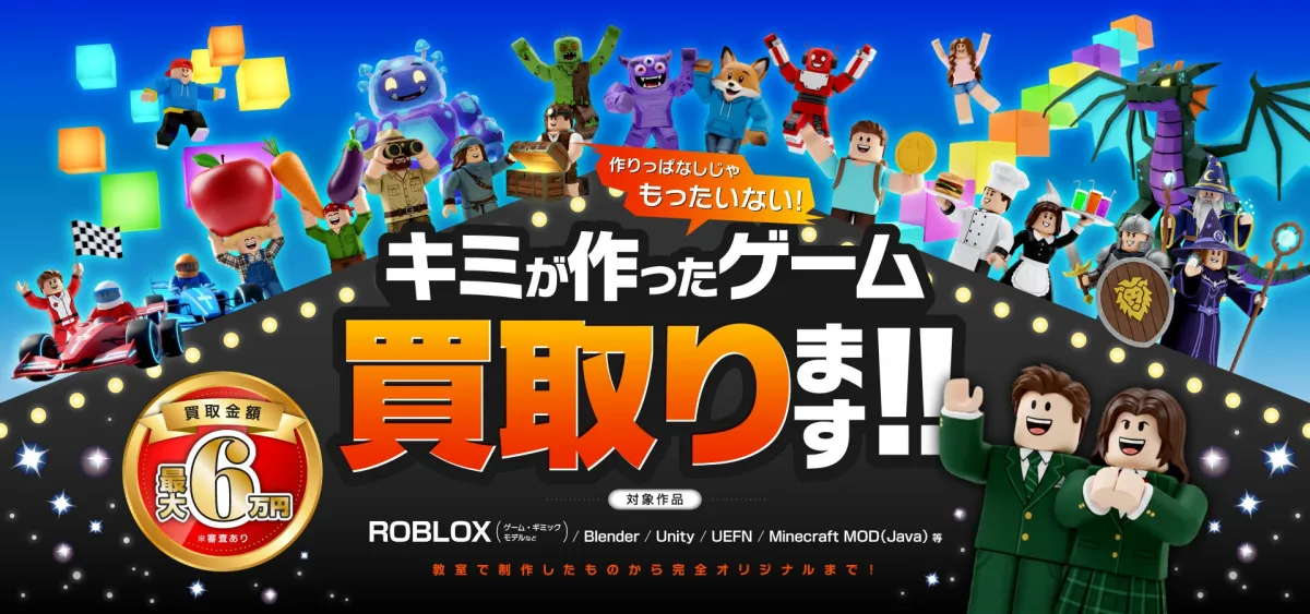 新たに導入される作品買取制度の概要は以下の通りです。対象となるのは、Robloxの作品はもちろんのこと、Blender、Unity、UEFN、Minecraft MODといったデジタル作品全般です。ただし、ScratchやMinecraftのビジュアルプログラミングのみの作品は買取対象外となります。