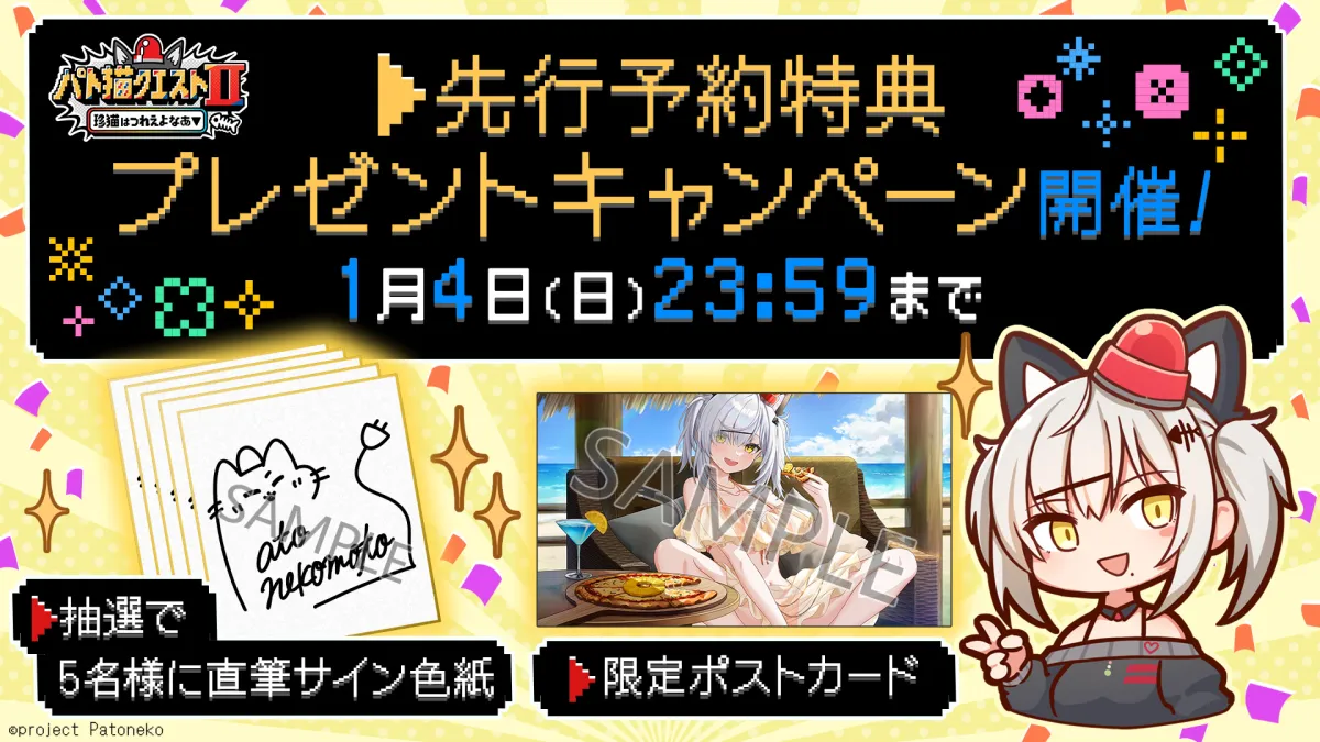 2026年1月4日(日)までの期間限定キャンペーンが注目されています。VTuber「猫元パト」が主役を務めるノベルゲーム『パト猫クエストⅡ珍猫はつれえよなあ』を予約購入した方には、さまざまな特典が用意されています。この新作ゲームは、猫元パトさん自身が本人役として全編フルボイスで楽しめるという、新しい体験を提供してくれます。