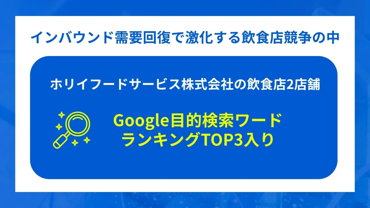 ホリイフードサービスが展開する2つの店舗が、Googleの目的検索ワードランキングでTOP3入りを果たしました。この成果は、訪日外国人観光客が「選んでいる」という明確な証拠です。これは偶然の集客ではなく、訪日前や訪中の検索行動によるものです。