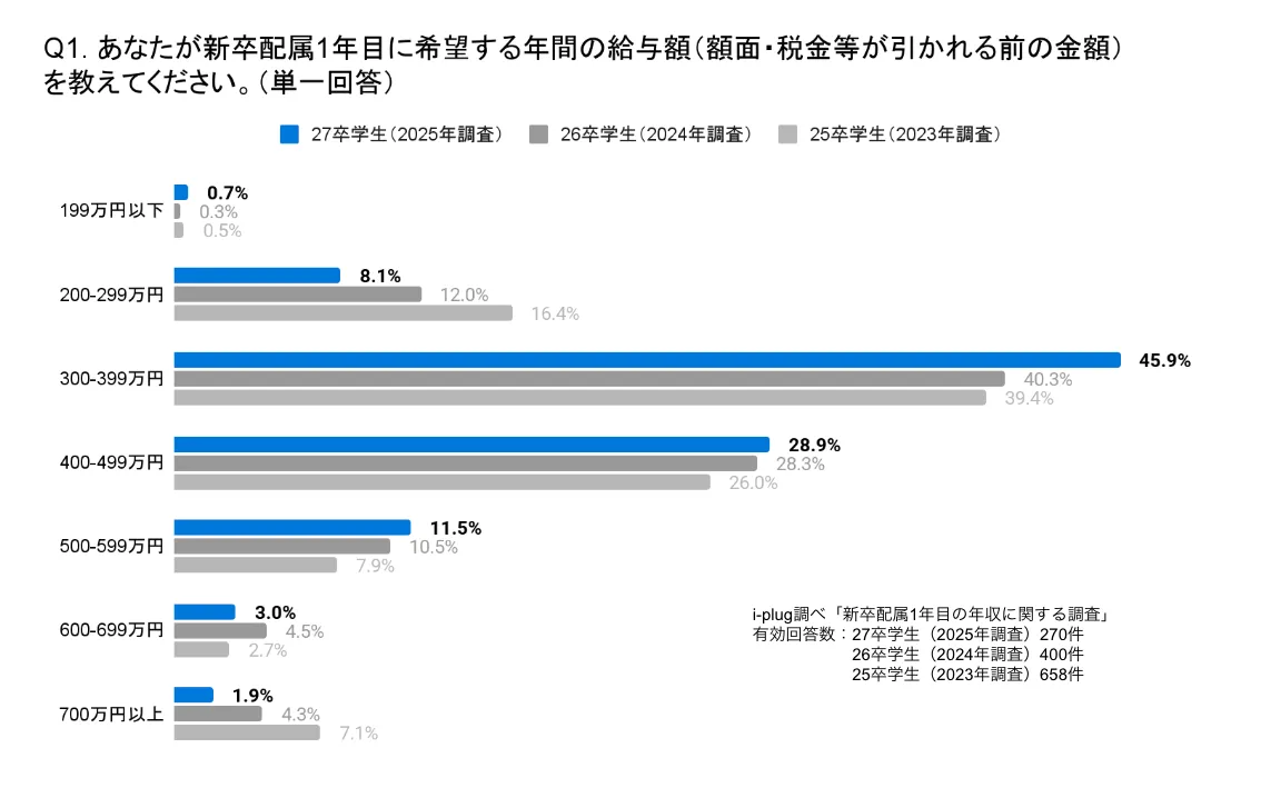 調査は、2025年9月に実施され、270名の学生が回答しました。その中で、新卒入社1年目の希望年収についての問いには、最も多くの学生が「300-399万円」を選択しており、過去3年間でこのレベルが最も人気となっています。他方で、「500万円以上」を希望する学生は前年比で2.9ポイント減少したものの、依然として高い数字をキープしています。