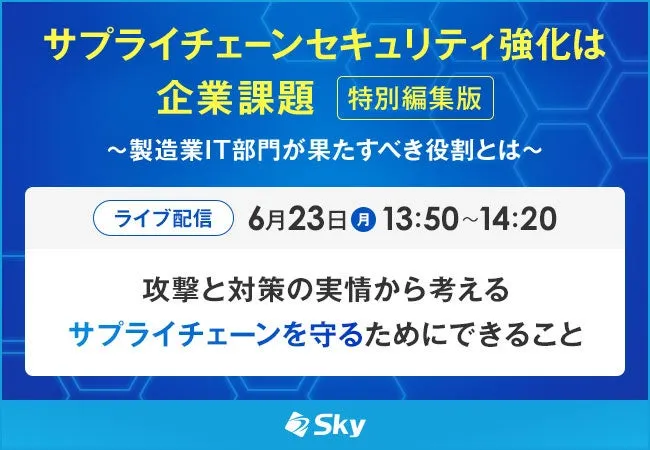 2025年6月23日、ITmediaエンタープライズが主催する特別編集セミナー「サプライチェーンセキュリティ強化は企業課題~製造業IT部門が果たすべき役割とは~」が開催される。このイベントには、業界内で注目されているSky株式会社が協賛し、「攻撃と対策の実情から考えるサプライチェーンを守るためにできること」というテーマで講演を行う予定だ。