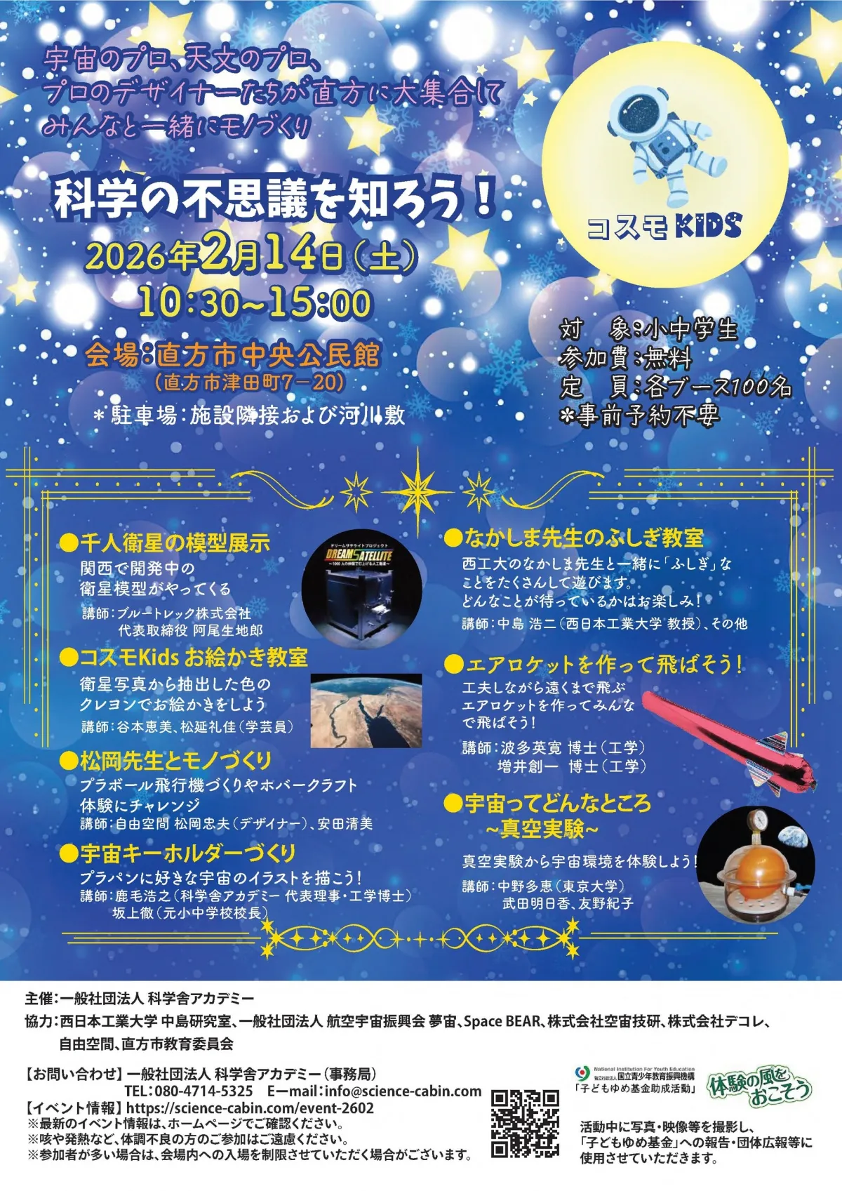 このワクワクするイベントは、一般社団法人科学舎アカデミーが主催しています。また、西日本工業大学の研究室や、航空宇宙振興会なども協力しており、地域全体で子どもたちの教育に力を入れています。