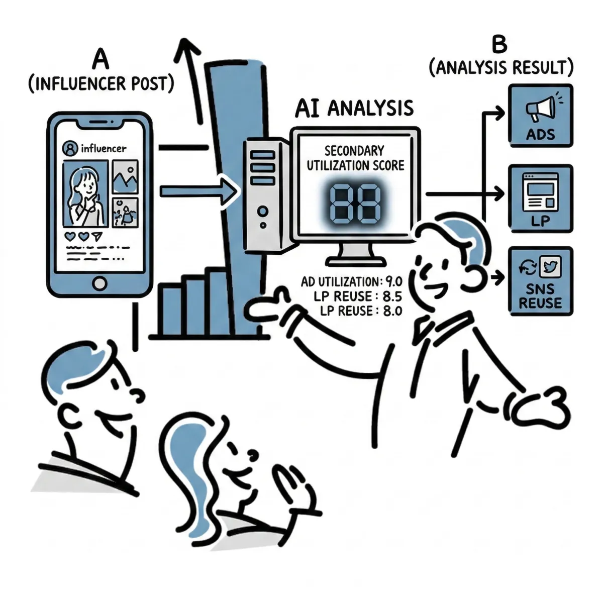 - - 被写体・商品フォーカス率:インフルエンサーの顔とPR商品とのフォーカスのバランスを評価し、広告レギュレーションに適合した視認性が確保されているかを判定します。