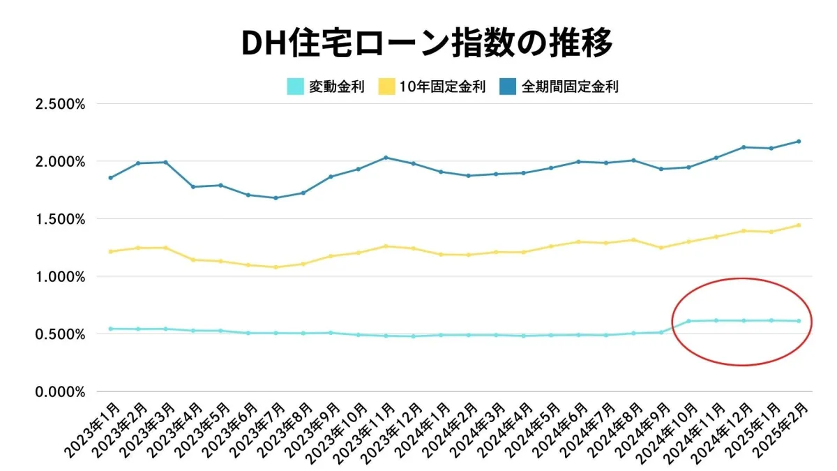 2月中旬、日銀は政策金利を0.5%に引き上げましたが、いくつかの銀行はこれに影響されることなく金利を据え置いたままです。これにより、DH住宅ローン指数の変動金利は0.611%に減少しました。銀行の利上げ方針がどのように実際のローン金利に反映されるのかは今後の大きな焦点となっております。