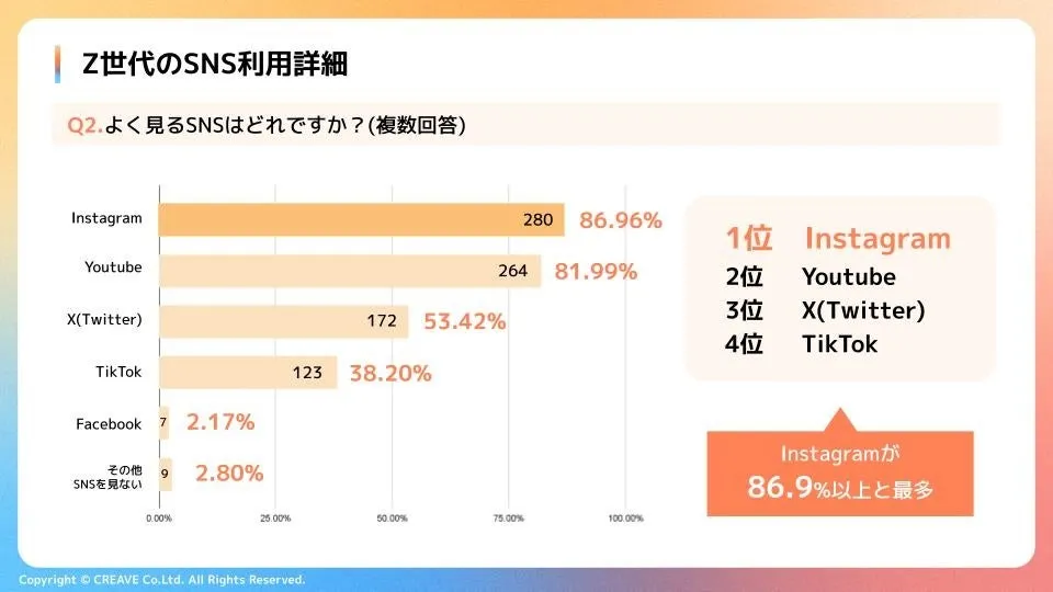 そのため、株式会社CREAVE(以下、CREAVE)は株式会社ガイアックスと協力し、2025年7月22日に『Z世代のSNS毎の使われ方が明らかに!Z世代の意識・SNS購買行動調査レポート』を公開しました。この調査は、Z世代をターゲットとする企業のマーケティング戦略の一助を目的に行われました。