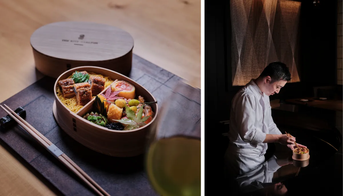 ザ・リッツ・カールトン福岡のオリジナルアイテムとして、博多曲物のお弁当箱には、ホテルの焼き印が施されています。また、籃胎漆器のお箸や博多織りの風呂敷がセットになり、贅沢な価値を提供しています。このお弁当箱に、九州の旬の素材を使用した料理が詰められ、日本料理「幻珠」にて心ゆくまでお楽しみいただけます。