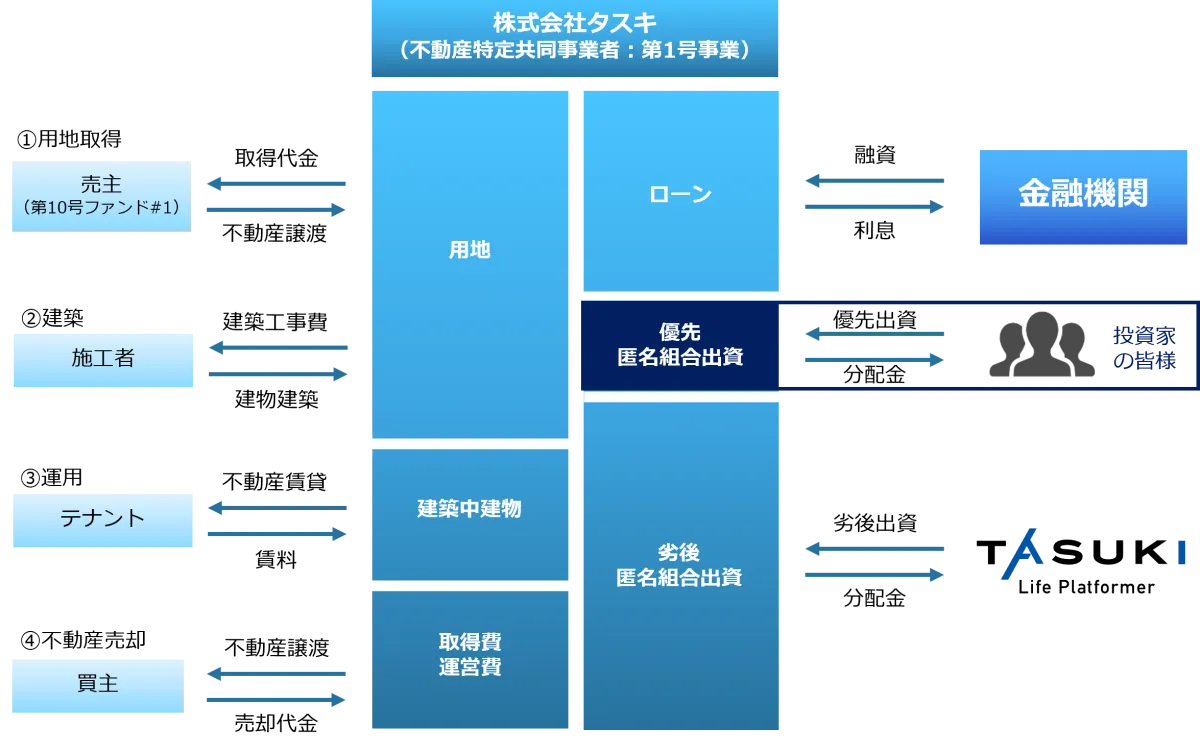 本ファンドでは優先劣後方式を採用しており、500口の優先出資を募集します。一方でタスキは2,400口を劣後出資します。この仕組みにより、万が一損失が発生した場合でも、タスキが先にその損失を負担することで、投資家の資金の返還が優先されるため、リスク軽減を図っています。
