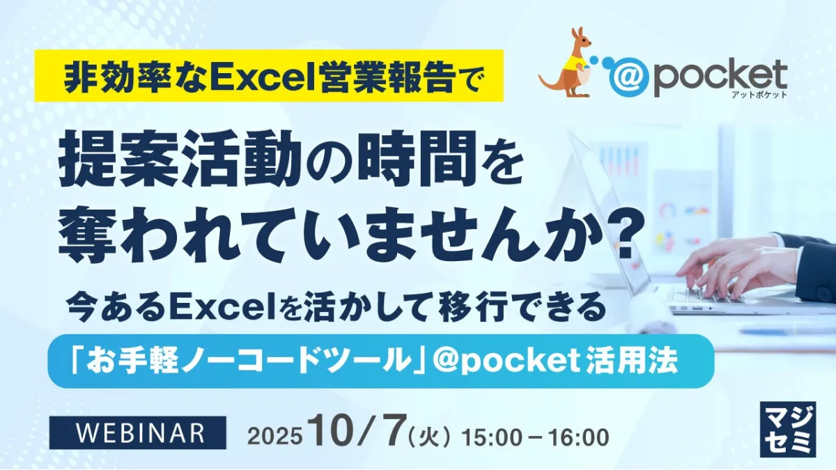 そこで、本ウェビナーでは、短期間かつ低コストで始められるノーコードツール「@pocket」を活用し、営業報告の無駄を省いて提案活動にもっと時間を振り向ける方法をお伝えします。このツールを利用することで、現在のExcelデータをそのまま活用しつつスムーズに移行できるため、現場の負担は最小限です。