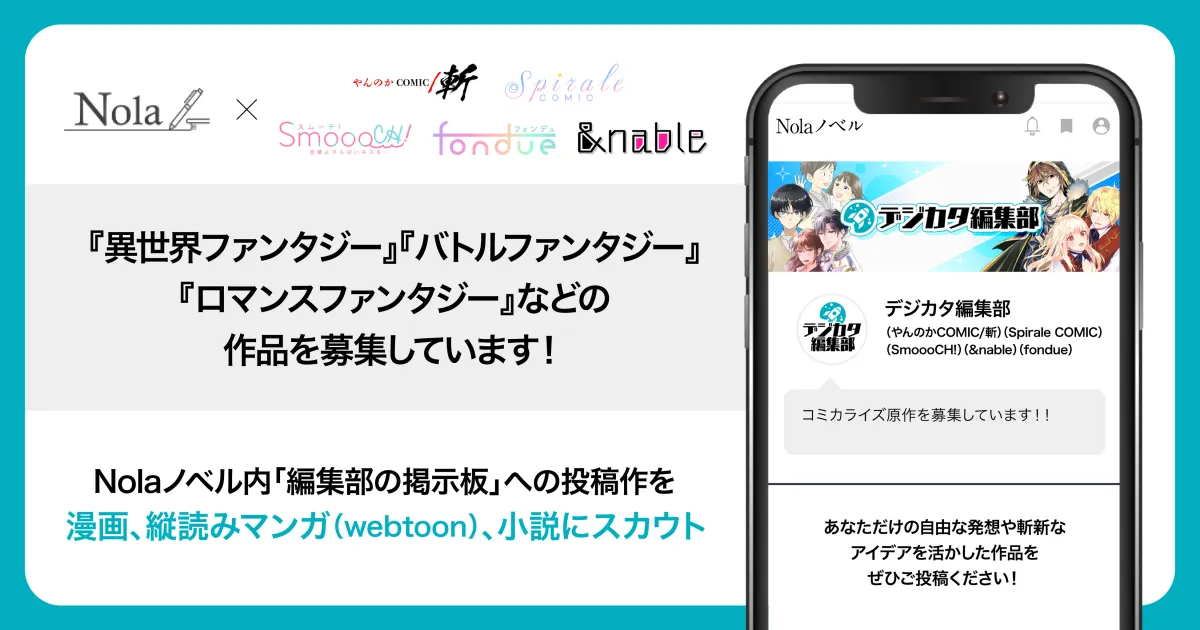 この取り組みは、Nolaの広範な作家基盤を活かし、デジタルカタパルトが求める作品を発掘することを目的としています。Nolaでは、作家が自由に作品を投稿できる小説投稿サイト「Nolaノベル」を運営しており、各レーベルの要望に応じたテーマが提示されています。この度、デジタルカタパルトの5つのレーベル(やんのかCOMIC/斬、Spirale COMIC、SmoooCH!、&nable、fondue)が参加し、各テーマに沿ったコミカライズ原作の募集を行います。