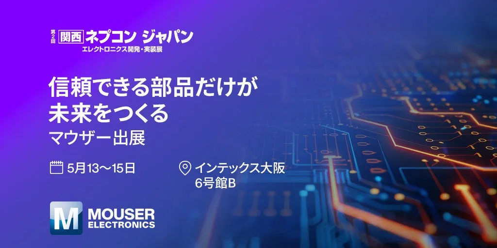 マウザー・エレクトロニクスが関西のエレクトロニクス業界に新たな風を吹き込むべく、2026年5月13日から15日までの3日間、インテックス大阪で開催される「関西ネプコンジャパン」に出展します。本展示会は関西地域で最も大規模なエレクトロニクス開発・実装展となります。