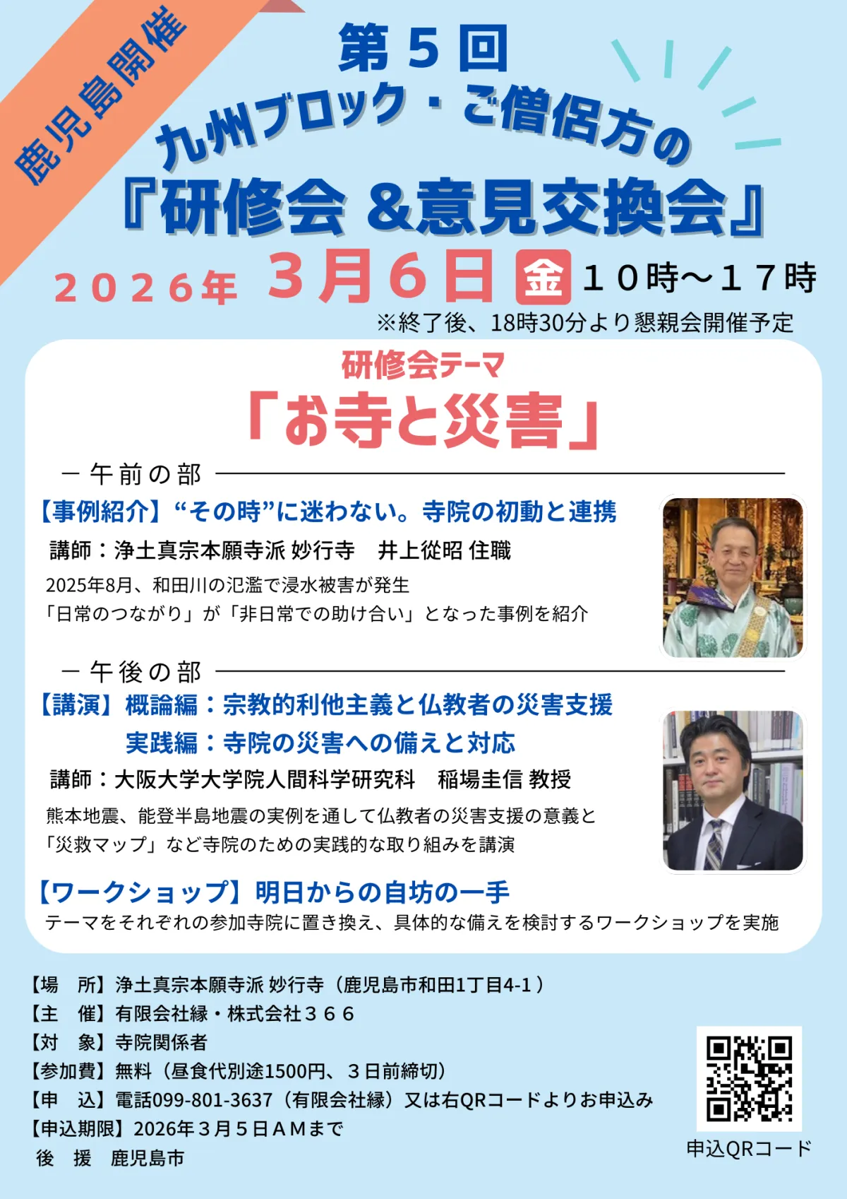 2026年3月6日(金)、鹿児島市において、超宗派の僧侶や寺院関係者を対象とした研修会が行われます。このイベントは、遺骨の粉骨や海洋散骨事業を展開する「有限会社 縁」と、お寺のDX支援を行う「株式会社366」が共催するもので、地域の防災力向上を目指しています。