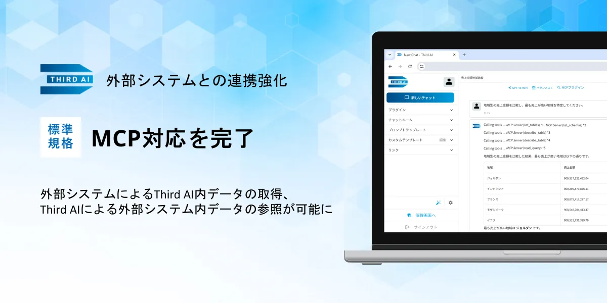 JTP株式会社(本社:東京都品川区、代表取締役社長:森 豊)は、2025年6月11日に、生成AIをビジネス領域で活用する「Third AI 生成AIソリューション」のアップデートを発表しました。このアップデートでは、外部データの取得と連携を可能にするMCP(Model Context Protocol)Client及びMCP Serverの機能を実装し、さらなる業務効率化を目指します。