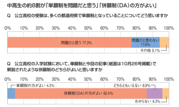 現在、多くの地域では単願制が採用されており、約77%の調査対象者がこれを「問題だ」と感じていることが明らかになりました。単願制では受験生が一校にしか出願できないため、選択肢の制限が生じ、自己の学力を十分に反映できないと考える生徒が多いようです。