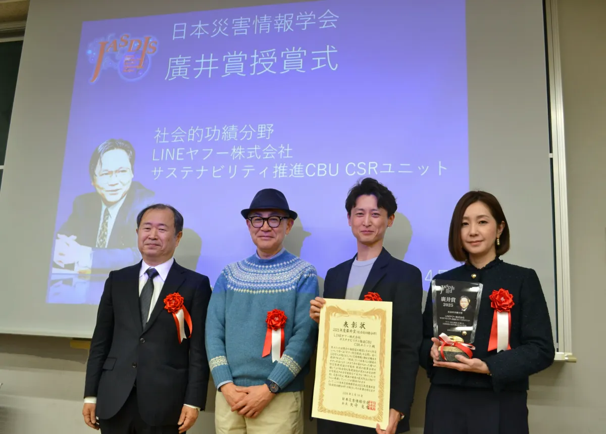 LINEヤフー株式会社が提供する「ヤフー防災模試」が、日本災害情報学会から「2025年度廣井賞」の社会的功績分野において受賞しました。この賞は、故・廣井脩氏の志を受け継ぎ、災害情報に貢献した個人や団体に授与されるものです。