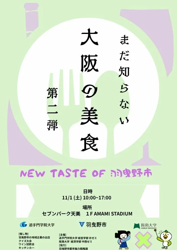 追手門学院大学の経営学部の学生たちが主導するプロモーションイベント「まだ知らない大阪の美食 第二弾 ―NEW TASTE OF 羽曳野市&吉野町―」が、2025年11月1日(土)にセブンパーク天美で開催される。このイベントは、大阪・羽曳野で創業以来、高品質な自社製ワインを提供する飛鳥ワイン株式会社との協力のもと、若者層に新しいワインの楽しみ方を提案することを目的としている。