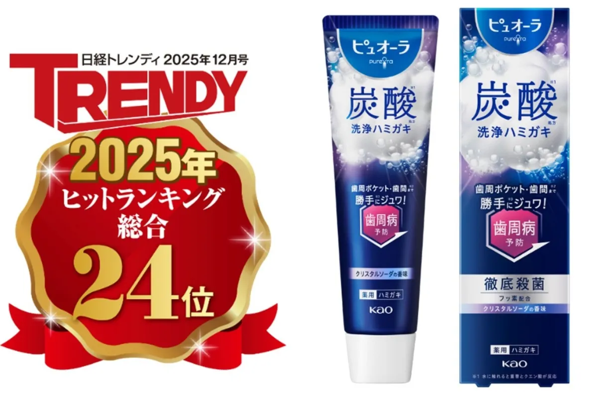 2025年12月号の「日経トレンディ」で発表された「2025年ヒット商品ベスト30」において、花王株式会社の『ピュオーラ炭酸ハミガキ』が見事24位に選出されました。本商品は2025年4月に発売され、やがて累計出荷数が200万本を超えるという驚異的な成果を収めました。これは消費者にとっての新しい価値提案が受け入れられた証と言えるでしょう。