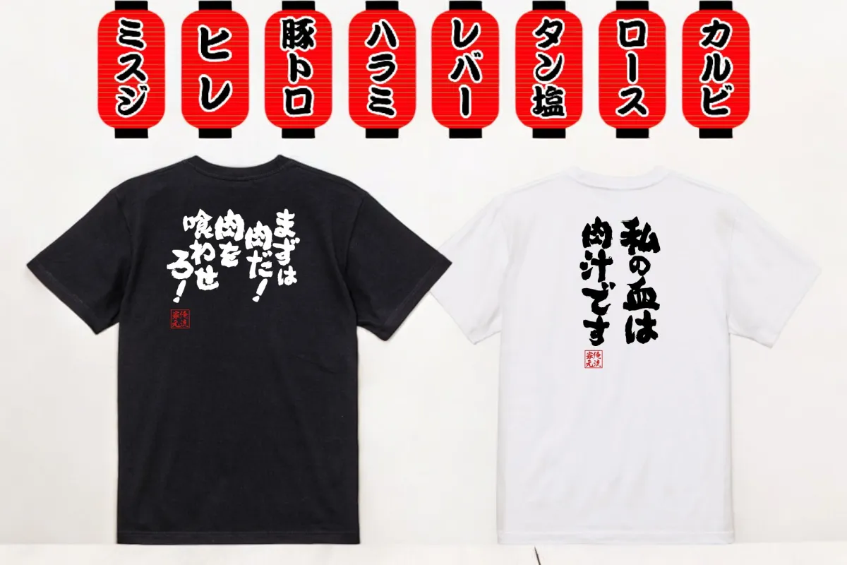 俺流総本家では、焼肉好きのために全10種の肉系語録Tシャツを用意しています。背中には肉愛が詰まったフレーズがドーンとプリントされており、見ざるを得ない存在感。肉に対する情熱やユーモアが詰まったデザインは、着るだけで会話のきっかけになること間違いなしです。