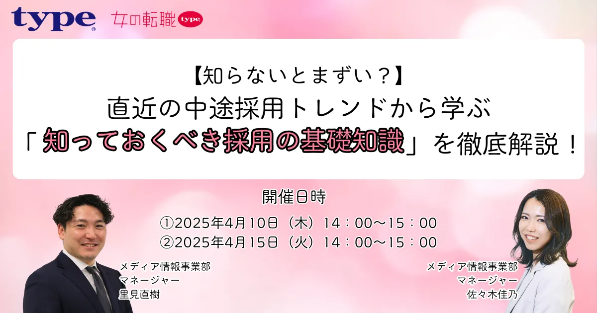 2025年4月に、転職サイト「type」によるセミナーが開催されます。本セミナーは、特に中途採用に興味がある企業の人事担当者に向けて、最新のトレンドや基礎知識を学ぶ絶好のチャンスです。