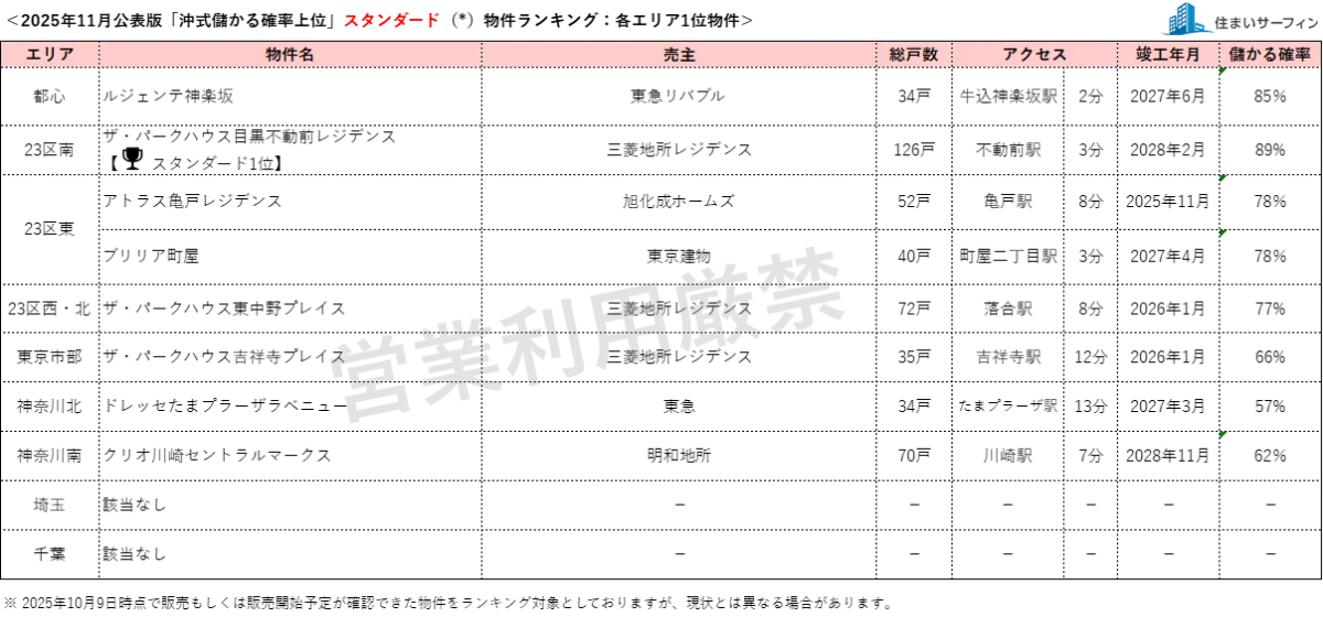 特に、現在販売中または販売予定の物件に関してランキングが作成されているため、購入予定の方にとっては貴重な情報源となります。販売予定が確認できた物件の中から発表されたデータは、2025年10月9日時点のものです。
