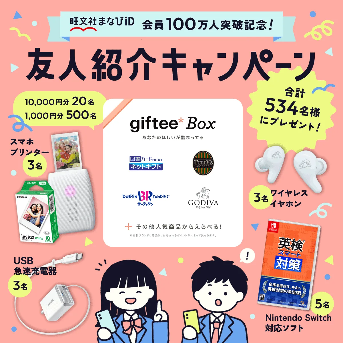本キャンペーンでは、すでに「まなびID」の会員である紹介者と、新たに登録する友人がペアで応募します。260組、合計520名がデジタルギフト「giftee Box®」を手に入れることができ、さらに14名には豪華賞品としてスマホプリンタやワイヤレスイヤホンがプレゼントされます。特に「giftee Box®」は、様々な商品と交換可能な便利なデジタルギフトです。