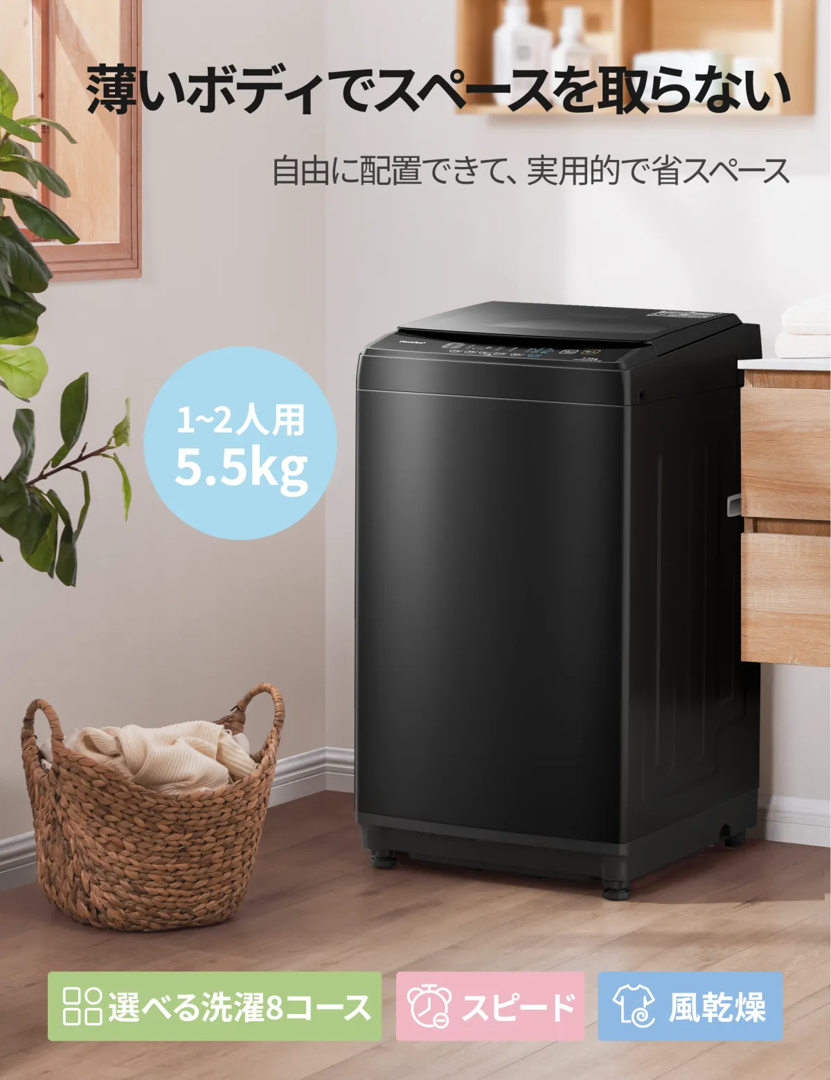 『COMFEE 5.5kg全自動洗濯機』は、狭い住宅でもスペースを有効活用できる洗濯機です。また、選べるカラーが用意されているので、インテリアに合わせたお好みのデザインを選べます。