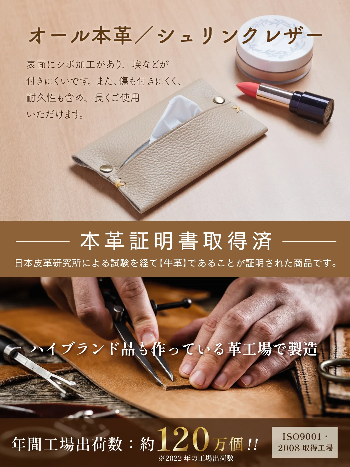 新バージョンのポケットティッシュケースは、2025年7月から販売が始まります。今までの人気のスタイルを踏襲しつつ、耐久性を強化しました。製品の特徴であるシボ加工が施された上質な牛革シュリンクレザーを使用し、高級感のある仕上がりになっています。複数のポケットから成るデザインで、コンパクトながらも2個のポケットティッシュを収めることができ、ニーズにしっかりと応えています。