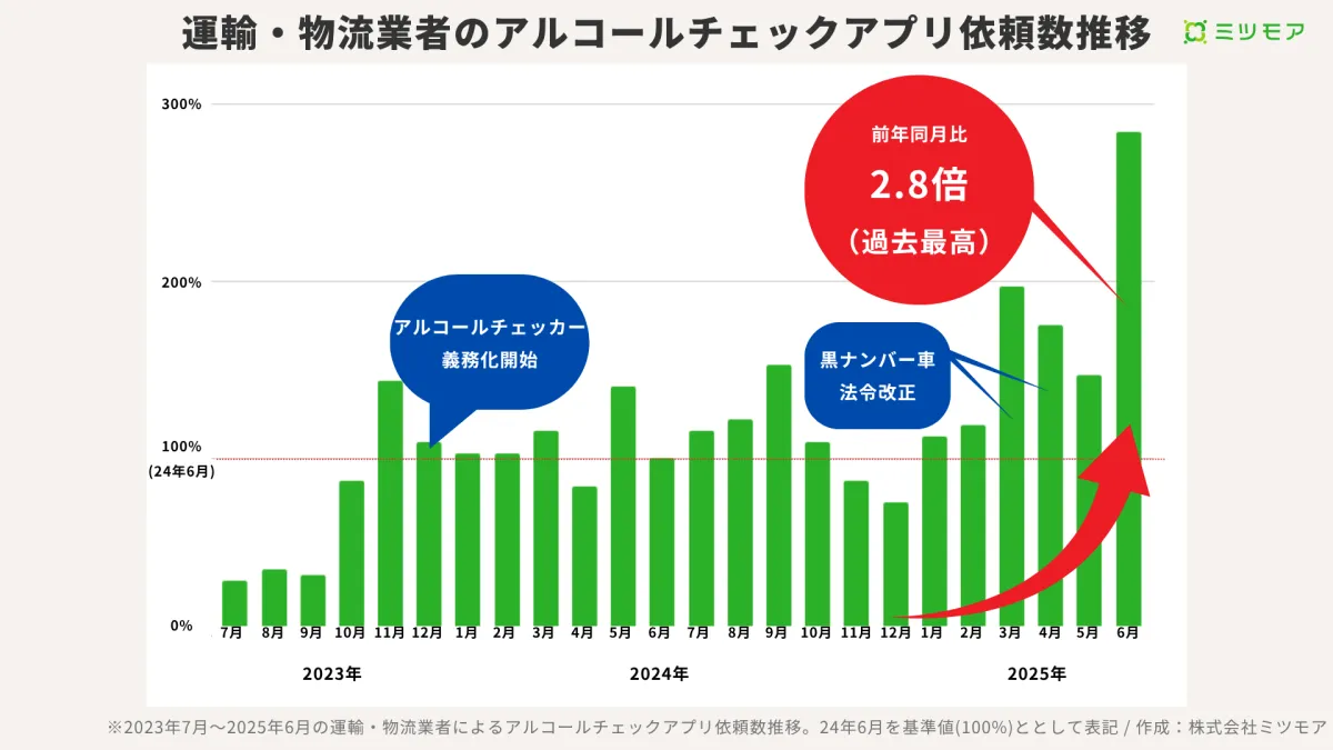 株式会社ミツモアが発表した調査によると、運輸・物流業界では、アルコールチェックアプリの導入依頼が前年比155%という顕著な増加を記録しました。この傾向は、業界が安全対策の強化を求められている証左と言えるでしょう。