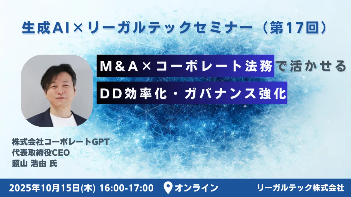 2025年10月15日(火)16時から、オンラインで「生成AI×知財実務セミナー(第17回)」が開催されます。このセミナーは、M&A実務における生成AIの活用と、それがもたらす変革について深く探る絶好の機会です。講師には、株式会社コーポレートGPTの代表取締役CEOである照山浩由氏が迎えられ、M&Aの現場での具体的な課題とその解決策が解説されます。
