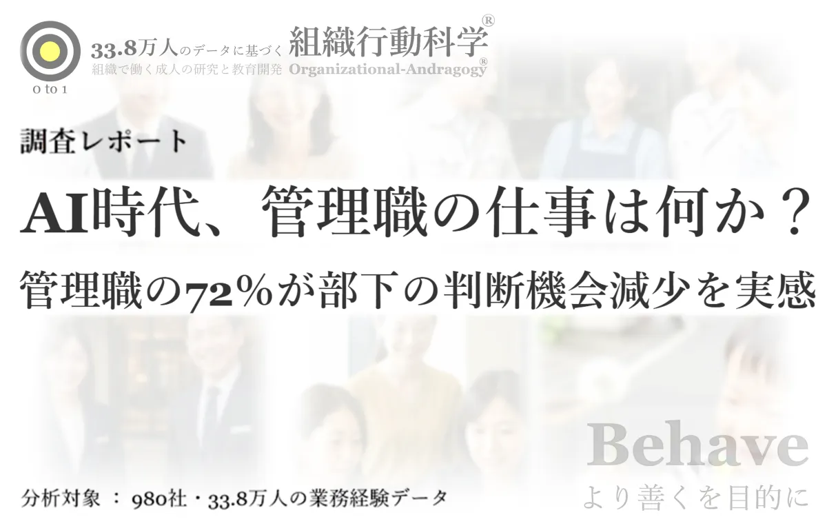 これまで、多くの業務は人間が判断し、実行してきました。しかし、AIの導入により、業務の自動化が進み、業務プロセスは前例や手順に基づくものが増加しています。デジタル化が進むに連れ、部下が日常業務の中で自ら判断する機会が失われつつあるのが現実です。管理職は、多くの部下が「判断機会が減っている」と感じていることから、AIの影響が大きいとされています。