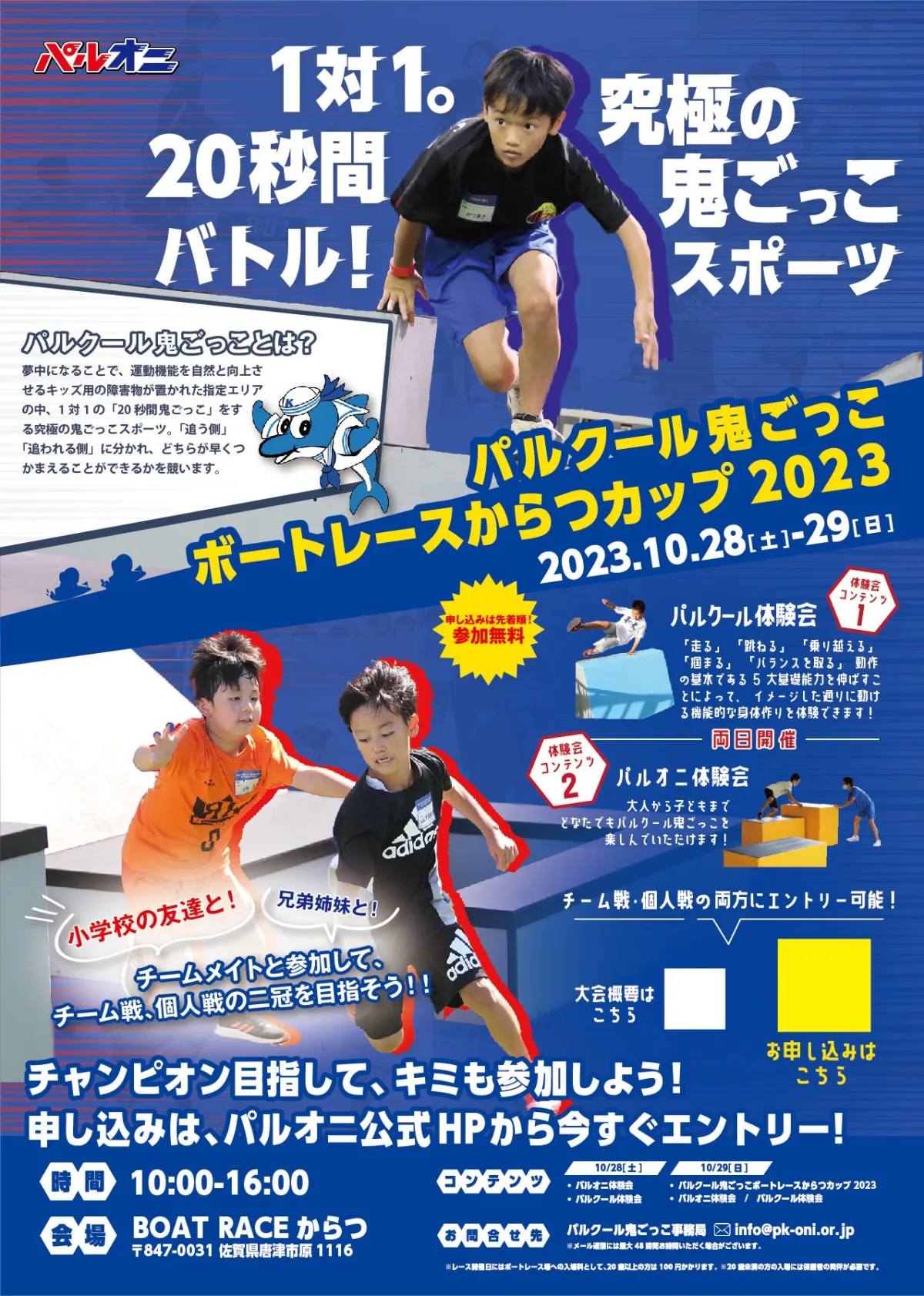2023年10月28日(土)と29日(日)の2日間、佐賀県唐津市のボートレース場で、親子で楽しめるユニークなイベント『パルクール鬼ごっこ ボートレースからつカップ2023』が開催されます。