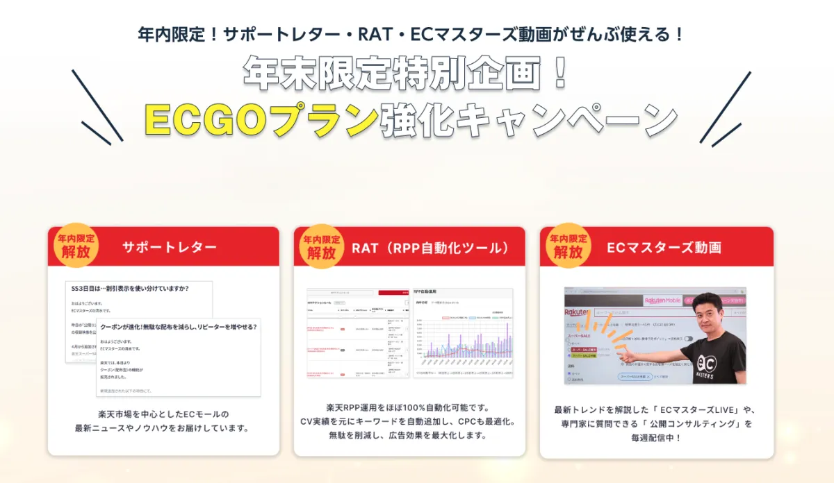 日本ECサービス株式会社が運営する『ECマスターズクラブ』は、EC事業者向けの新キャンペーン「ECGOプラン強化キャンペーン」を2025年11月1日から開始します。このキャンペーンは、特に楽天市場を利用しているショップオーナーに向けて、業務の効率化を図るものです。キャンペーンの期間は2025年12月31日までの予定で、特別に「RAT」「サポートレター」「ECマスターズ動画」の機能が利用可能になります。