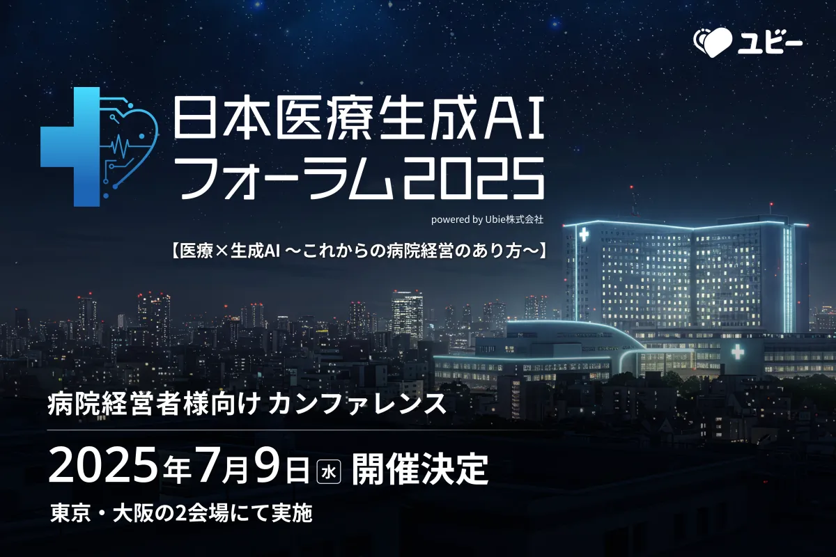 2025年7月9日(水)、病院経営者様のためのカンファレンスが東京国際フォーラムにて開催されます。「日本医療生成AIフォーラム2025」は、Ubie株式会社の主催で行われ、生成AIに関する最前線の知識や活用事例が共有される特別なイベントです。