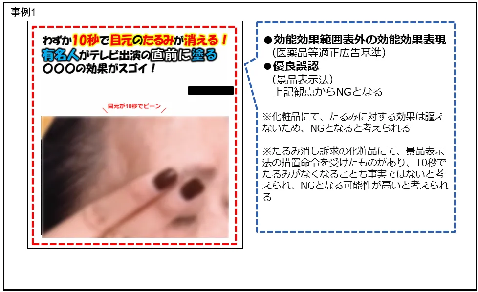 調査の結果、いくつかの広告で以下のような法令違反の疑いが確認されました。ア、イのカテゴリに分け、具体的な表現を示します。