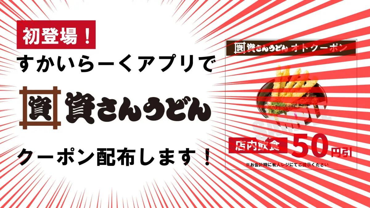 資さんうどんは、2024年3月に100店舗の出店を控え、感謝の気持ちを込めて「すかいらーくアプリ」を通じてお得なクーポンを配布します。このクーポンは、店内での飲食時に50円引きで利用可能です。