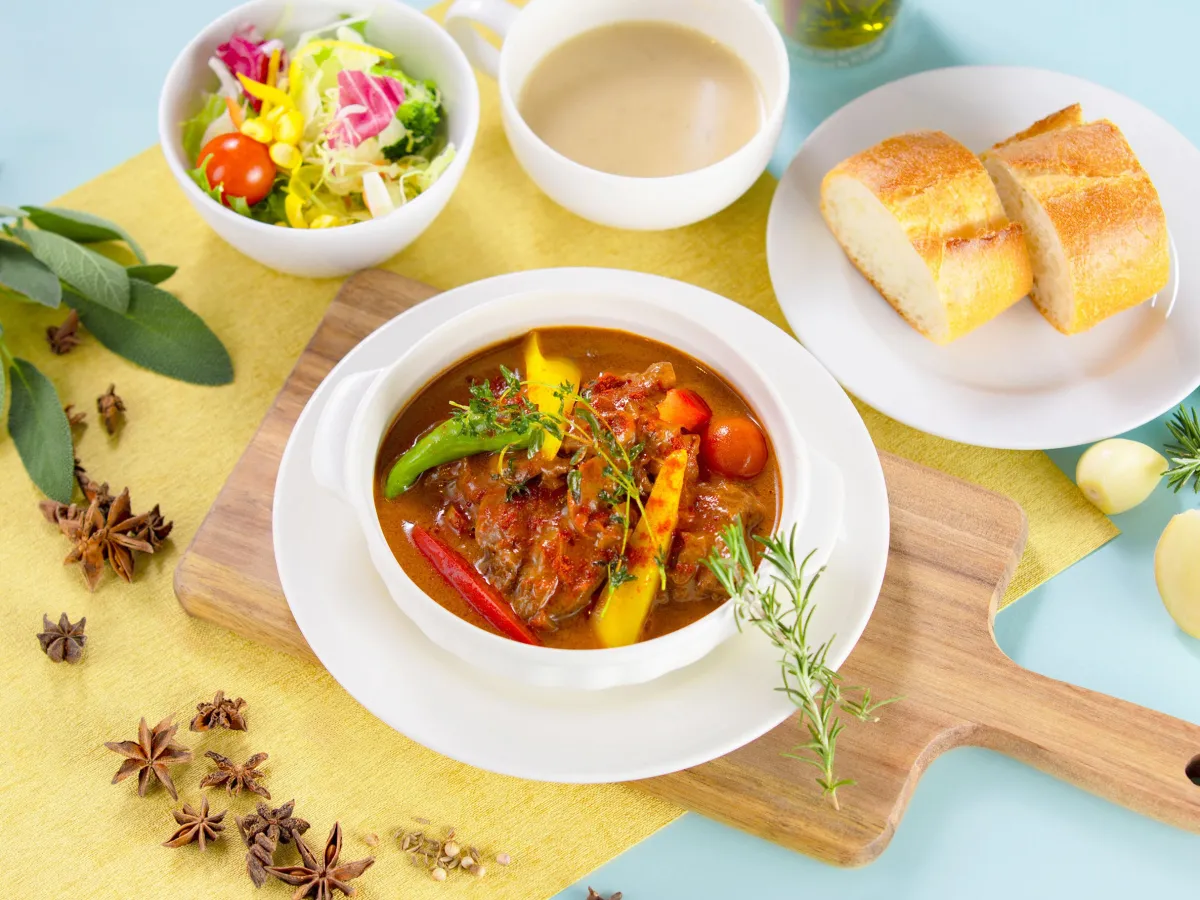 1階の「レストラン&カフェ Lagoon」では、親しみやすい価格でスパイスやハーブを使った料理が楽しめます。スパイス香るグヤーシュや和ハーブで味わう刺身膳は、1,700円から1,900円で楽しめます。また、数量限定の「白桃のプレミアムパフェ」もおすすめ。甘い香りのスパイスで仕上げた贅沢な一品で、初夏の味覚を堪能できます。お飲み物として用意されているチャイもぜひお試しください。